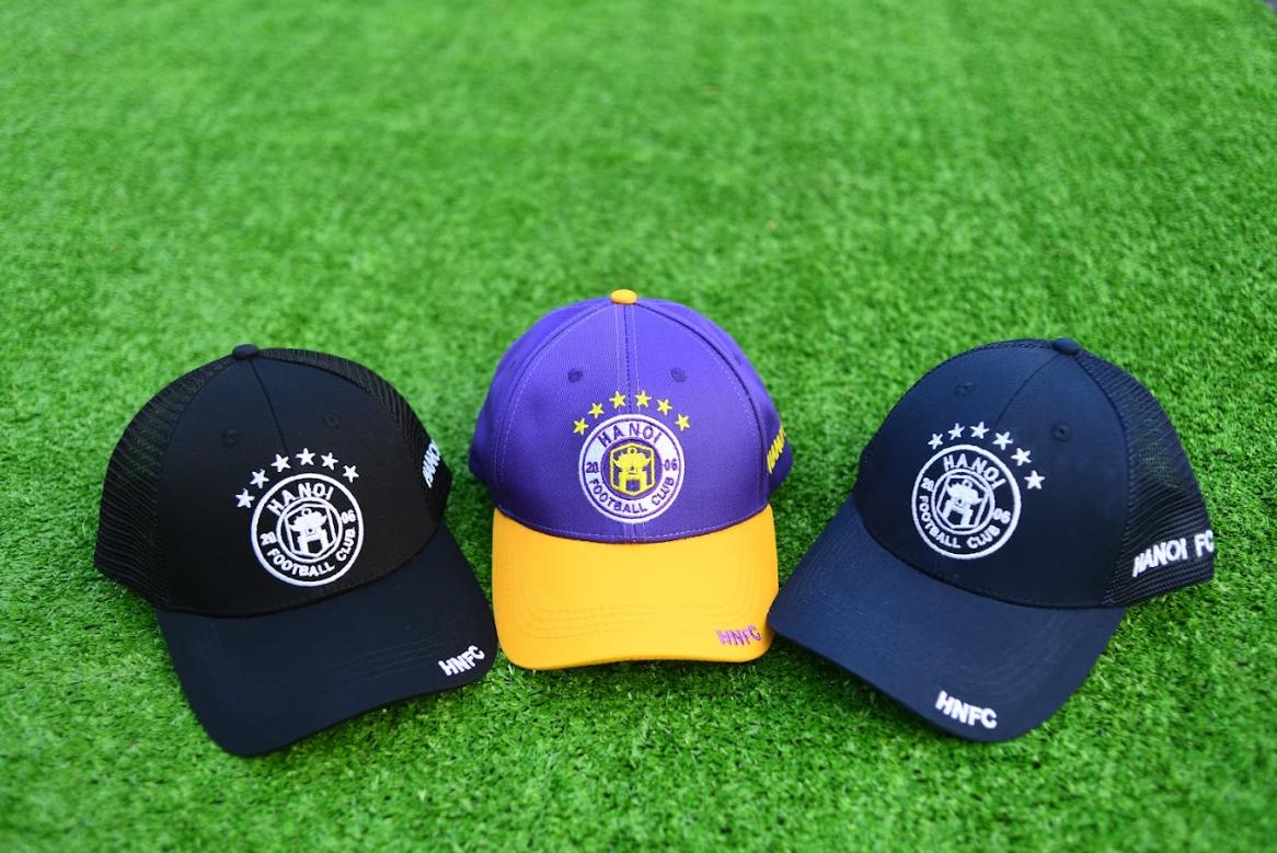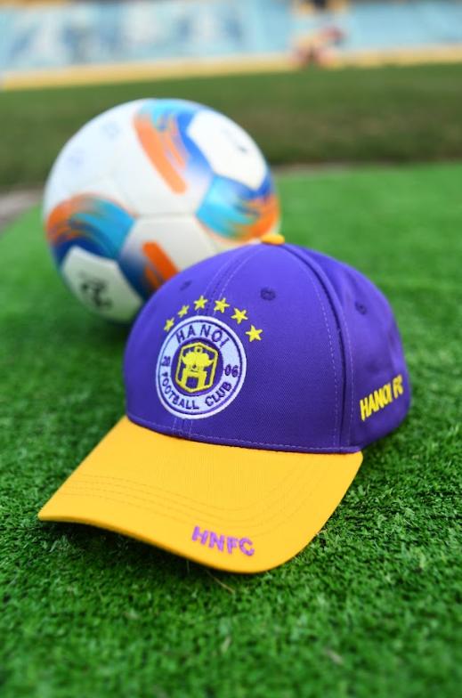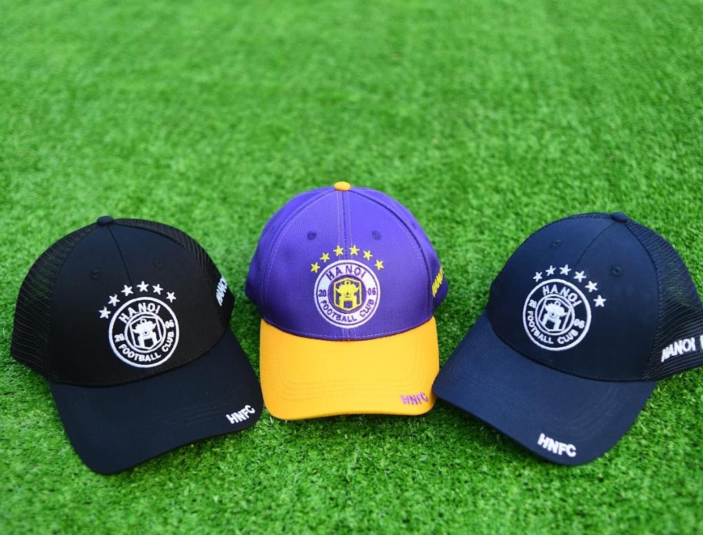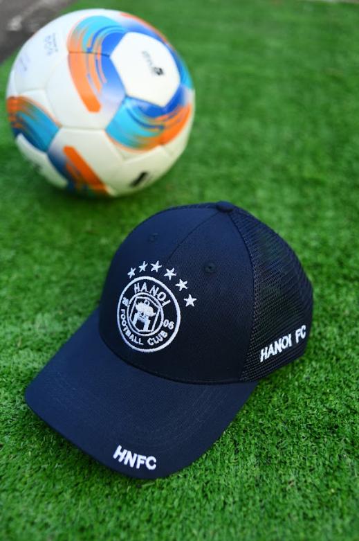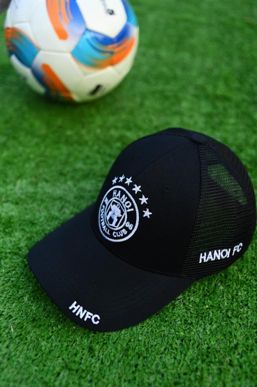 Logo Hà Nội FC thêu nổi 3D ở chính diện, dải sao trang trí trên vương miện; chữ HANOI FC thêu ở thân và HNFC ở mép lưỡi trai.